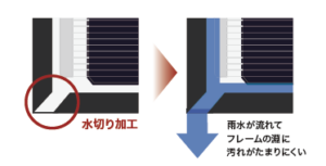 ・ 水切り加工:汚れや水が溜まりにくく、メンテナンスの手間を軽減